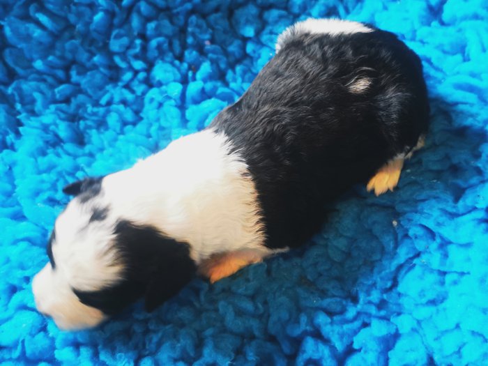 Puppy 1, male, black & white, tailless, complete broad white collar, white blaze, white to elbows, 300g