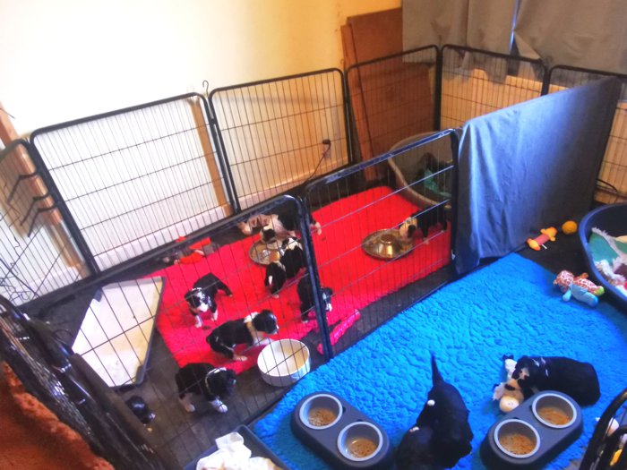 Moving day for the puppies. They are now in their bigger puppy pen in the dog room (which we have turfed the other dogs out of). At first they found it ab it over whelming, with lots of hiding behind the dog bed, But after an hour or so they began to enjoy the extra space and things to explore.